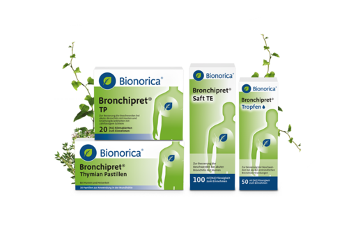 Bronchipret Tropfen: Zur Besserung der Beschwerden bei akuten entzündlichen Bronchialerkrankungen und akuten Entzündungen der Atemwege mit der Begleiterscheinung „Husten mit zähflüssigem Schleim“. Das Arzneimittel wird angewendet bei Kindern ab 6 Jahren, Jugendlichen und Erwachsenen.